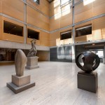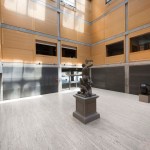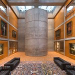 The Center’s concrete exterior structural frame, featuring matte steel and reflective glass infill panels, confers a monumental presence in downtown New Haven. The geometric five-floor interior is designed around two interior courtyards, and comprised of a restrained palette of natural materials, including travertine, white oak, and Belgian linen. The majority of the Center’s intimate galleries were designed by Kahn to maximize natural daylight. The building’s design, materials, and skylit rooms provide an environment for the works of art that is simple and dignified.