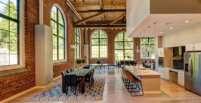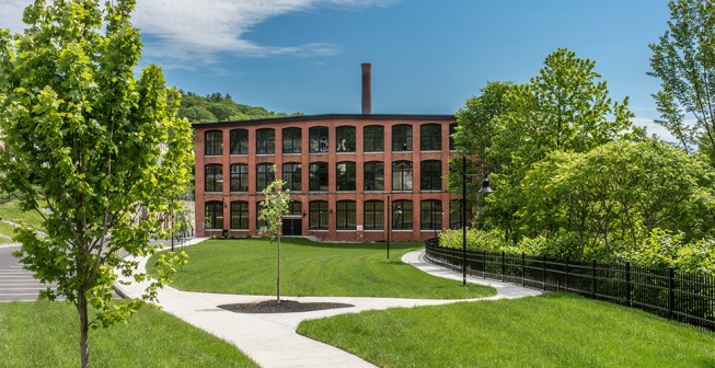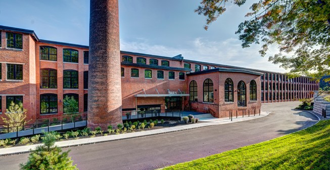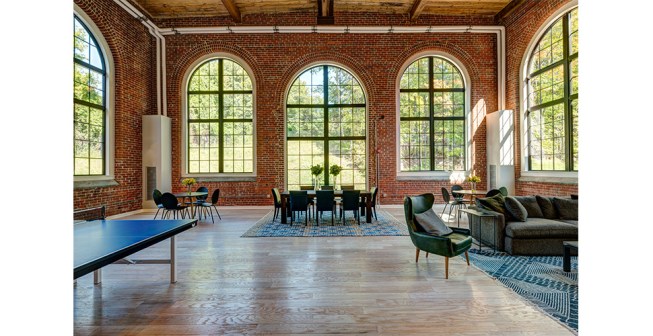 The 100+-year-old Nockege River Mill Building, formerly home to the Fitchburg Yarn Company, is situated on 7.4 acres on the bank of the Nashua River. Spanning 182,500 square feet across three floors, the thoughtful restoration and adaptive reuse of the historic structure features 57 oversized, modern market-rate loft units. The building boasts more than 280, 8-foot by 10-foot windows, providing each unit with expansive views and an abundance of natural light. Of the total 96 units, 39 are designated as affordable. The reimagined space offers community areas, a fitness center with yoga room, and a grand central atrium gallery, featuring exposed brick, beams and columns throughout. Due to the building’s proximity to the river, flood mitigation was central to the design solution; a concrete slab was built 27″ higher than the original wood deck, resulting in the first floor sitting above the 100-year floodplain. Additional restoration work included repointing and repairing the exterior brick envelope and chimney stack, as well as structural reinforcement to the roof. Yarn Works has been nominated by the state Historical Commission to be placed on the National Register of Historic Places.