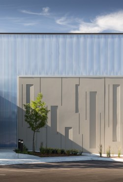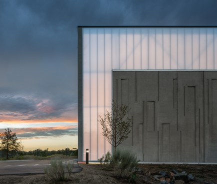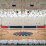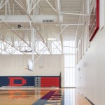A thoughtful design elevates The Yates Pavilion above the customary “gymnasium box”. The carefully crafted exterior and lighting environment reflect the school’s passion for sports. Tilt up concrete panels were utilized for the gym wall structure due to their speed of erection and cost effectiveness. A customized pattern of inset panels and reveals was incorporated to articulate the monolithic concrete wall surface. Internal insulation contributes to the building envelope performance and LEED Gold certification. Polycarbonate panels at the north and south faces of the building provide ample day lighting and are tuned to ensure even light distribution across the day. In the evening, when most games are played, the glow from the gym expresses the activity within.