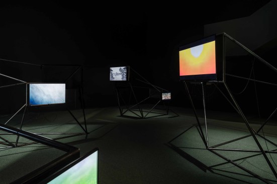 Interspecies Cinematic Encounters, 2020, is an installation that explores ways in which cinema has imagined, represented, and incarnated encounters belonging to different realms. Based on Jean-Michel Frodon and Rasha Salti’s abstract idea of organic ‘clusters’ with screens showing excerpts from films where encounters between humans, animals, plants, the atmosphere and supernatural beings. The ‘clusters’ are displayed like coral reefs and low-level audio montaged from the films fills the room gently.