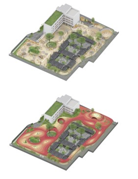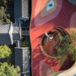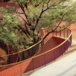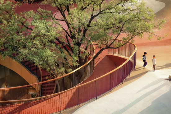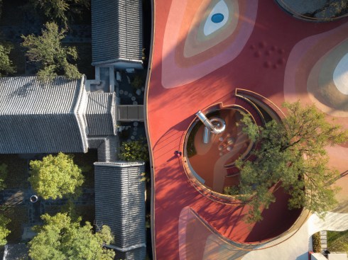 At ground level, MAD designed three courtyards around several old trees on the original site. The new courtyards correspond to those of the old Siheyuan structures, providing the teaching spaces with light, ventilation, and an outdoor extension, while slides and stairs connect the courtyards to the rooftop landscape above.
