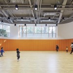 The transition space from the first floor to the sunken level on the east side of the lobby is cleverly designed as a theater; the top of which is surrounded by a circular wall of bilingual cartoon books. The theater stage doubles as the entrance to a two-level indoor playground, which serves not only as a space for children’s activities, but also a place for the whole kindergarten to hold arts and sports events.