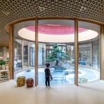 As one enters the interior from above, the atmosphere feels warm and bright. Responding to the sensitive sense of scale and comfort experienced by children, the interior of the building is suspended from a single aluminum grille, which lowers the visual height of the scheme while instilling the interior with a family-like warmth. Meanwhile, floor-to-ceiling glass walls allow sunlight to stream through the interior, while forming a visual connection with the old courtyard house. Here, the three-hundred-year linear history between the old and new buildings becomes three-dimensional.