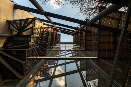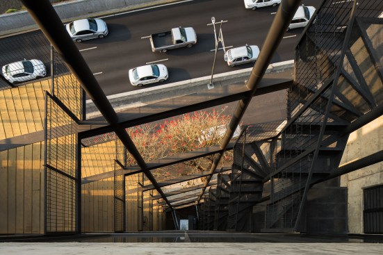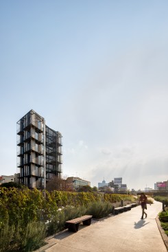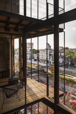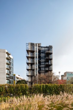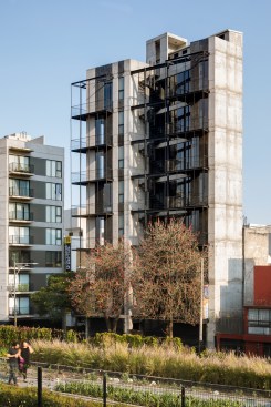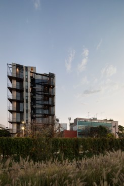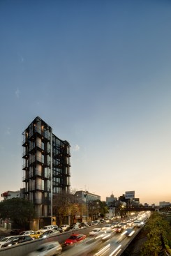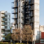 The land where the apartment building is located has an area of 92m2, with an irregular trapezoidal shape that further complicates the project design. The lot has two street fronts, including one that is 8 linear meters reducing down to only 4 meters, and the second is 15 meters long, overlooking one of the most important avenues in CDMX, along which runs a linear park built on the Rio de la Piedad, a river piped with sewage.