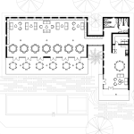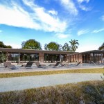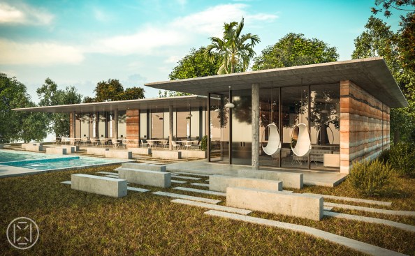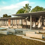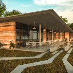 The concrete columns and concrete corner walls support the flat concrete roof topped by green grass, emulating a common element on the site, the trees. This allowed for semi-structural rammed earth walls to wrap the masses offering floor to ceiling glazing section to allow sunlight deep inside the volumes and also facilitate cross ventilation.