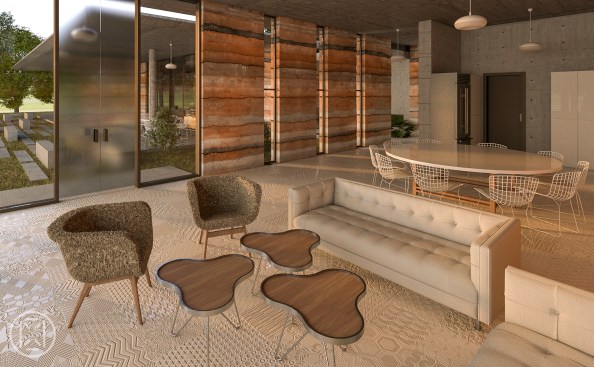 The building is a showcase of one of the prominent materials in the reduced palette used for the construction of the whole estate. Rammed earth is a construction technique used to complement the main materials, notably naked concrete and wood.