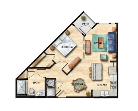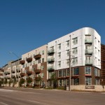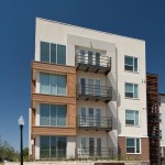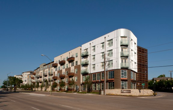 Located in an up-and-coming north oak cliff neighborhood in Dallas, the Zang Triangle project presented both a challenge and an opportunity to the developer and the design team. With a target market of active professionals working at nearby hospitals and within Dallas, the site on Zang Boulevard is convenient to nearby Bishop Arts District, downtown Dallas and a major highway. A trolley line route serving the Oak Cliff neighborhood is planned right by the site along Zang Blvd. To maximize building footprint on the sloping triangular site, units are built up to the sidewalk, surface parking are kept to the minimum, and a partial terrace level resulted in a five story massing at the leasing office area. The sweeping view towards downtown Dallas and the Trinity River is quite stunning, all the units feature balconies and large windows, taking in such views.