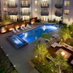 At the heart of the project is a larger courtyard. A rusted iron low wall with window boxes separated the courtyards into two areas; one with an outdoor seating and the community lounge with glass overhead door, while the larger area features the pool with an adjacent exercise room.