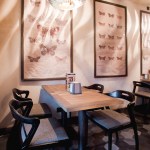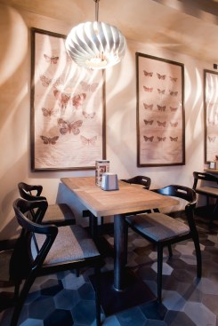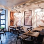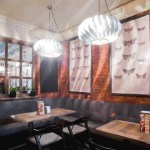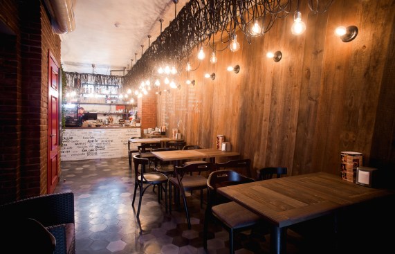 “Zappa” has a spirit of a small American coffee shop that sells both coffee and sweets. In this project we used our originally designed lamps, furniture and self-manufactured cement floor tiles.