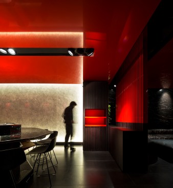 Red orange reflecting suspended ceilings enphasize the visual perspectives and identify the different areas of the hall, the sushi bar and a small more intimate room in the bottom, dividers and wall coverings formed by the close succession of thousand of vertical black timber elements, lacquered from one meter up of glossy red-orange, drive and mark the going through, while a rice paper backlit wall underlines the central focus of the restaurant, the Kaiten and the open workstation of the sushi master.