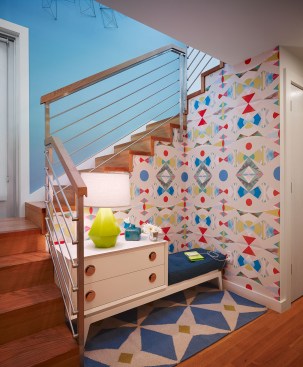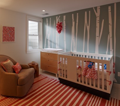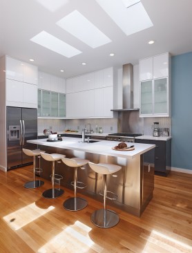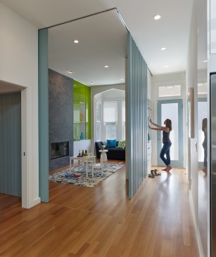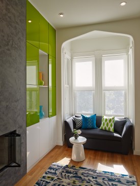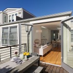In the past, the original four-room house had a rear kitchen and family room addition that led to an enclosed exterior corner staircase with access to the playroom, two bedrooms, and a bath in the basement level. The house was re-conceptualized by moving the staircase to the center of the plan and removing a majority of the walls, which allowed for a great room with open kitchen, dining room and living room. The front two original rooms were kept; although the one room features moving walls that close off the former living room to create a guest room. The other parlor remains as a study. Cabinetry is mostly Ikea due to budget. New skylights create a loft feel; a total surprise in this inner Richmond location. By placing the staircase in the middle, the back playroom could be converted into a master suite with full bath. The existing two bedrooms, full bath, and garage remain.