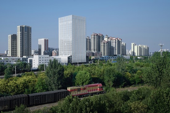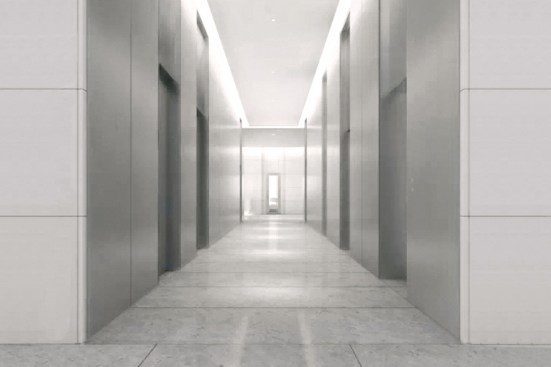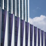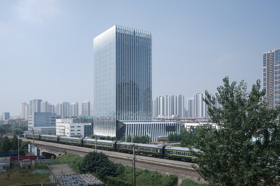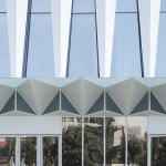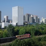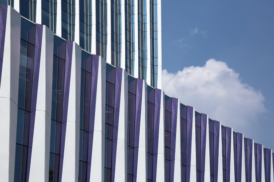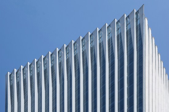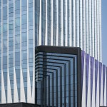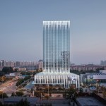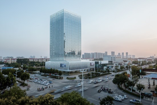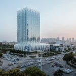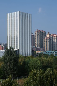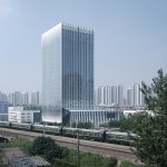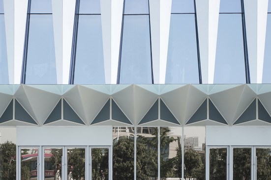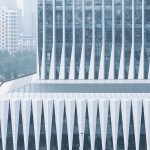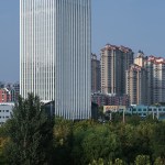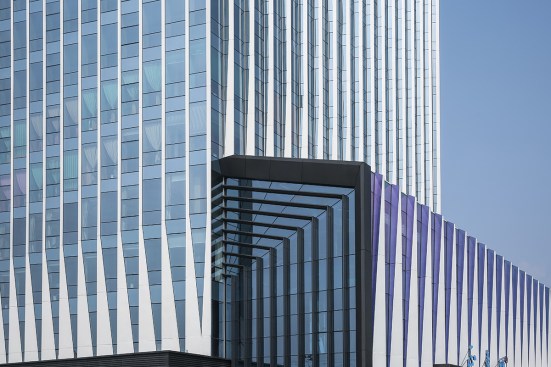 In vertical direction, components run though the whole facade. Around the top and the bottom of the tower, the facade components change from line to surface rhythmically. Near to the ground, the facade of the podium is detailed by folded iridescence aluminum panels in geometrical form. The alternate reflections of natural light and surrounding scenes from the aluminum panels and the glasses gives the facade spatial characteristic, thereby merging the exterior atmosphere with facade itself. Physically, the façade of architecture exists in an unmitigated static state but in environment, the time and space give it correlation between dynamic and static characters.