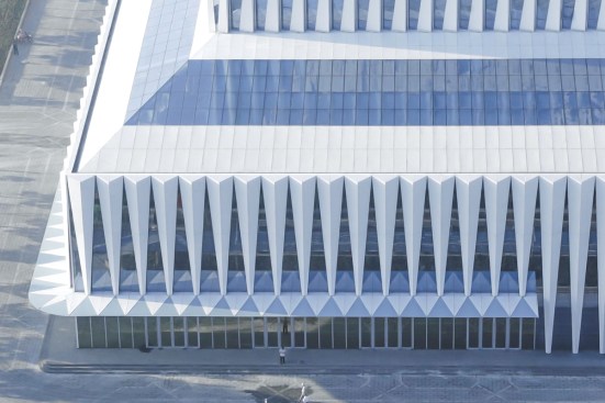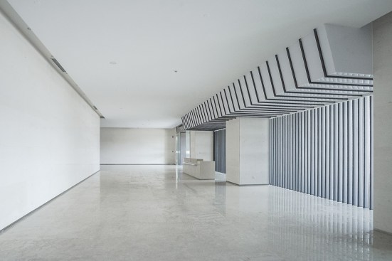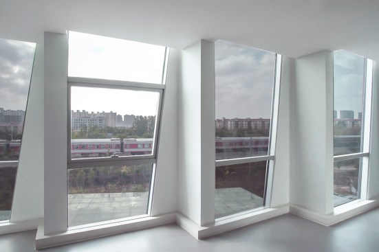 The east and west sides are folded up perpendicularly to face the river and the urban respectively. Solid aluminum panels in east are sharper and leaving a 1.8-meter glass surface to guide the view to the riverside actively. On contrast, the west is relatively gently and because of the issues of western exposure and views etc., the width of the glass surfaces are reduced to 1.2 meters. Overall, it forms a condition that the fluid facade is relatively more see-through in southeast and more solid in northwest to respond its particular context.