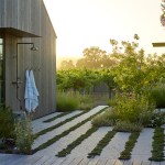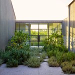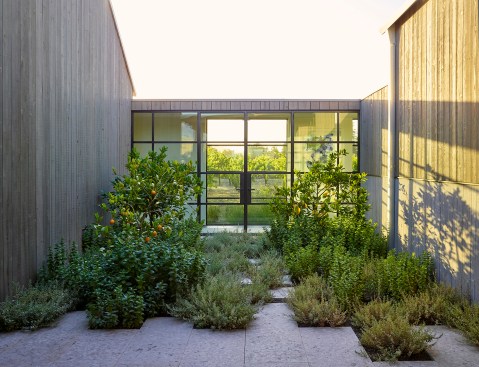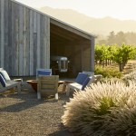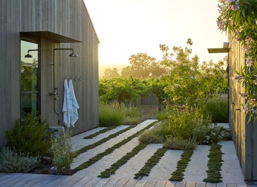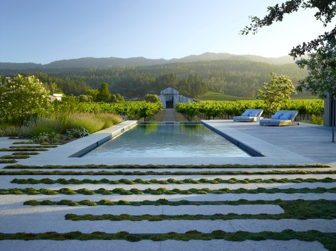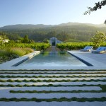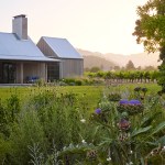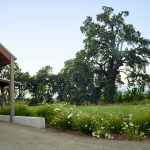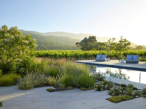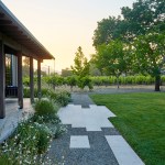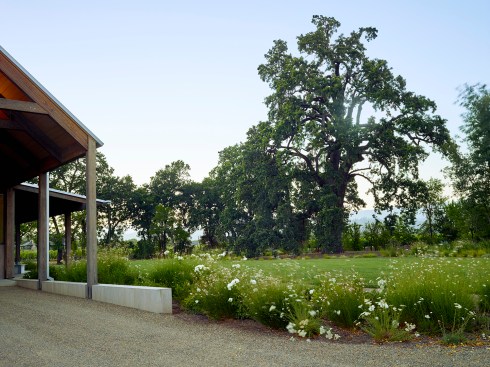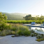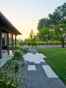 Moving through the house, windows frame the foreground of perennial plantings and pull the eye out to the greater vineyard and the hills beyond. At the pool patio, a Valley oak anchors the patio and is accented by smaller scale Chitalpa trees that emerge from the teak deck and stone patio. Set within the patio is a smaller garden filled with fragrant citrus and mint. The pool edge is softened by a larger perennial garden that bleeds into the vineyard and brings butterflies and hummingbirds to the edge of the pool.
