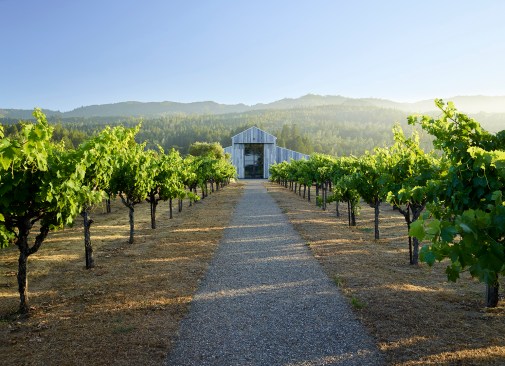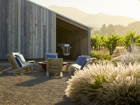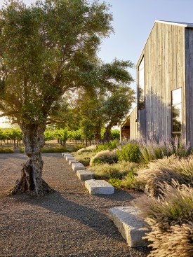 Set within one of the oldest Zinfandel vineyards in California, the St. Helena residence floats above the surrounding vines, extending the landscape into the house and pulling life out into the garden. An olive tree lined gravel driveway frames the entrance, culminating in the oak-lined property edge, where an existing heritage oak anchors the property. This oak orients the site, marking the central axis of the house, pool and—through the vineyard—the barn. Salvaged ancient olive trees are integrated into the barn landscape, tying into the reclaimed wood of the barn siding and framing the entrances to the building. Exuberant perennial plantings frame the trees and provide seasonal interest—Nepeta flowers and Little Bunny grasses bloom in early spring, followed by a flurry of summer color from Agastache, Perovskia, Lavender, and Gaura.