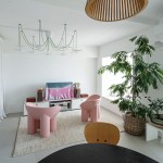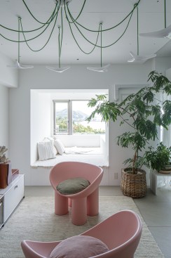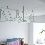 It was fundamental to blend in with the greenery surrounding the building to feel immersed in nature. The vegetation of the living room are leaf-plants, with their natural green colour that creates a nice transition from the outside wild to the cosy inside. The toplight lamp has been chosen accordingly, with its vivid green wires that remind a branch of a plant.
