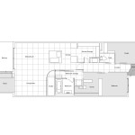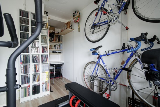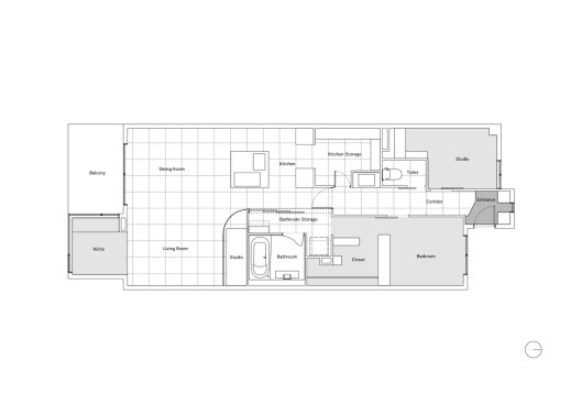 The service rooms are arranged on a grid developed on both sides of the hallway: the bedroom and the studio are facing north, each one with their own window looking at the communal spaces of the construction; while the toilet, the bathroom and the kitchen storage are located in the middle of the plan, helping to create a distinct separation between night and living area.