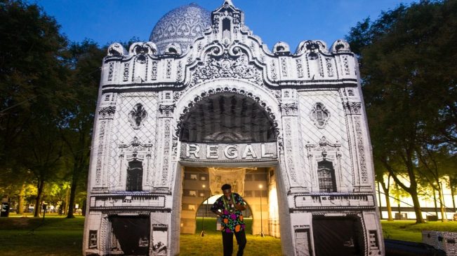 The latest in the Floating Museum series, for Mecca, resurrects the famed Mecca Flats as a 30-foot “ghostly architecture,” confronting cultural erasure while celebrating Bronzeville’s rich legacy.