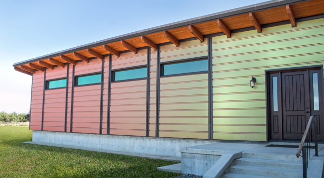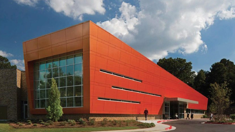 This 400,000-square-foot renovated facility is clad in 90,000 square feet of insulated metal wall panels coated in a mosaic of four shades of blue-green. The project features Sherwin-Williams’ Fluropon 70 percent PVDF coatings in a range of hues—including Key Largo, Tarryton, and Sweet Nothings—that update the building’s appearance with visual depth and movement.