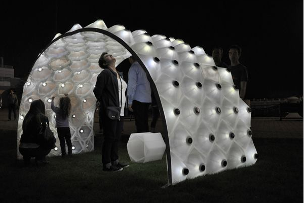Called the Solar Bytes Pavilion, the structure comprises 94 modules, or “bytes,” that each contain an integrated solar-powered LED, solar panel, and light sensor that work independently to store energy. Each module uses its stored solar energy to glow at night for different lengths of time based on how much solar exposure each cell received during the day, tracking the sun’s daily travel from east to west by the half-hour. But inconsistent environmental conditions throughout the day result in a varied lighting pattern at night. For example, if the morning is clear and the afternoon is cloudy, the pavilion’s east side would illuminate for a longer period of time than would the west side.