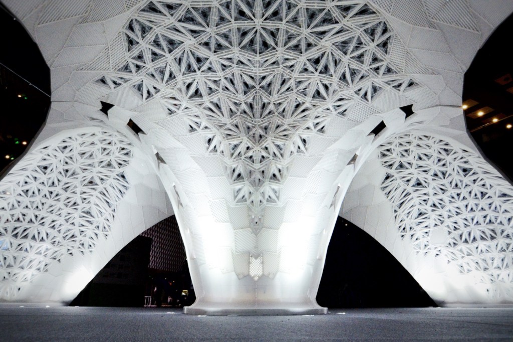 This silkworm-inspired structure alleges to be the world’s largest 3D-printed architectural pavilion. Located in the atrium of the Parkview Green office complex in Beijing and fabricated by local studio Laboratory for Creative Design, Vulcan is a draw at the ongoing Beijing Design Week 2015. The arched pavilion’s cocoon-like construction comprises more than 1,000 unique 3D-printed building blocks that took 20 large-scale printers a month to produce and a 15-person crew nearly two weeks to assemble, Designboom reports. The resulting form harks back to an actual silkworm-led construction, the 2013 Silk Pavilion from MIT’s Mediated Matter Group, which paired a robotic arm to print the frame and an army of live silkworms to fill in the gaps with their thread. Albeit synthetic, Vulcan—at roughly 8 meters long and 3 meters tall—is modeled after a mushroom cloud or fire plume, its makers say, evoking its namesake, the Roman god of fire.