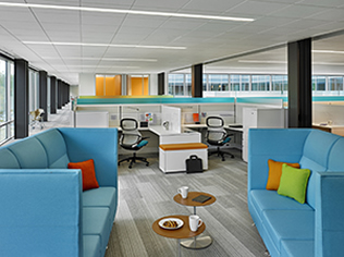 Background noise and mechanical accessibility were top concerns for the team at Jacobs, the firm charged with designing the interior of the CertainTeed/Saint-Gobain North American headquarters in Malvern, Pa. The original plan for the 119,000 square feet of open office space within the facility called for CertainTeed Ceilings Symphony f fiberglass panels to be installed in a floating island configuration over the workspace areas. The contrast of the smooth, white panels against the black-painted plenum and exposed ductwork in corridors and transition areas would be dramatic.