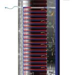 Inside the concave curtainwall on the Bow’s southern façade, a series of vertical atriums runs up the building’s full height, separating the offices from the exterior. The void acts as a natural solar-heat collector, creating a buffer of sun-warmed air that helps keep occupants cozy. In the winter, heated return air escapes from the adjacent offices into the atrium and rises upwards. “As the air goes up,” explains Cosentini’s senior vice president Scott Ceasar, “it warms up [further] from the sun. Then we capture it at the top.” The captured exhaust, prior to its discharge, is run with intake air from outside through a heat exchanger and heat recovery unit, “preconditioning” the fresh air that is then pumped down a series of risers into air towers on each floor and back into the offices. As a result, less mechanical energy is required to warm the airflow.