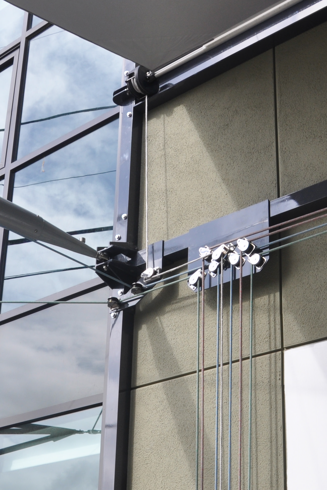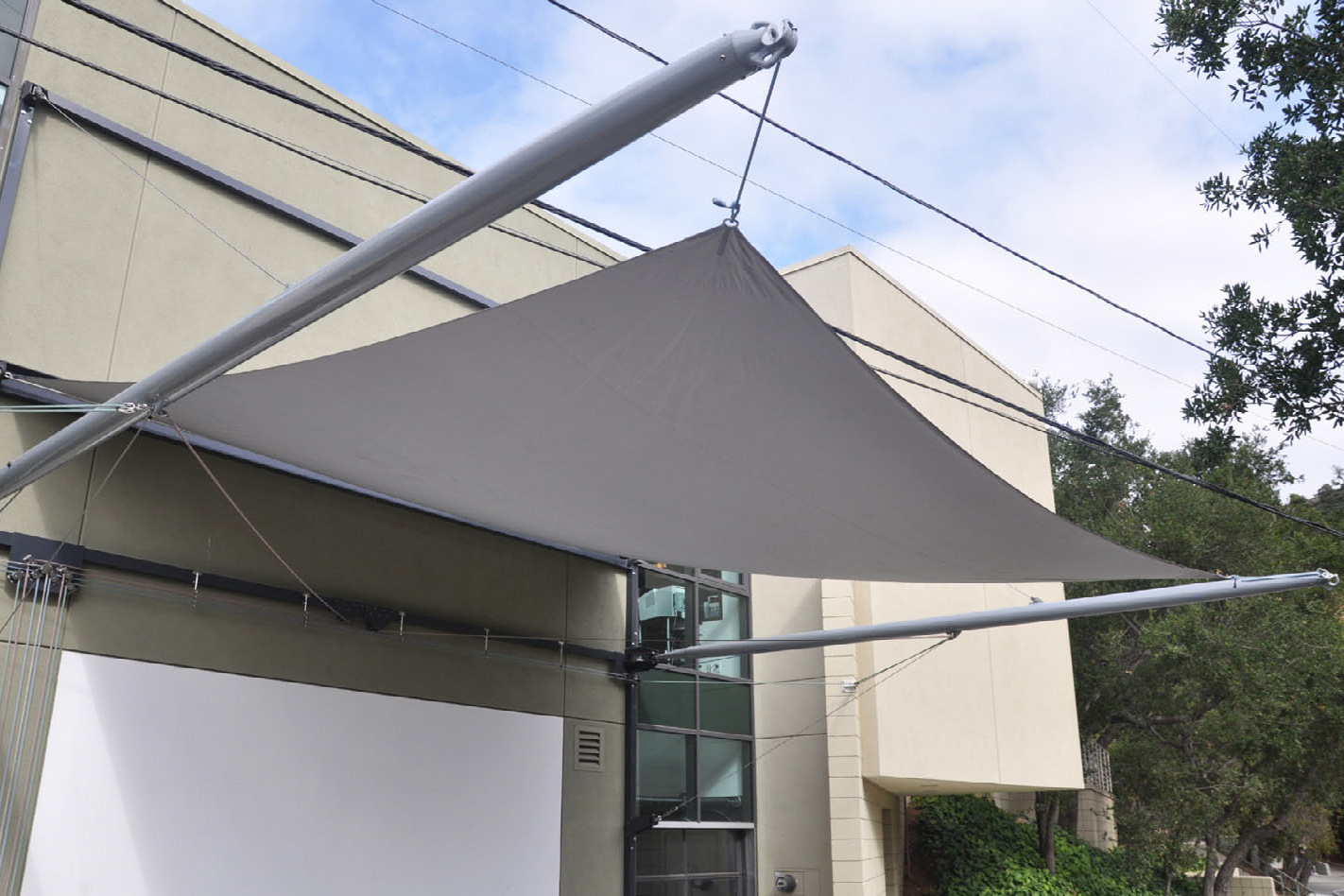 Von Oeyen’s design takes into consideration the multiple uses of the adjacent sloping exterior driveway. The fixed-tension rods from below provide enough clearance to allow vehicles to pass underneath for student drop-offs. In their closed position, the spinnaker poles fold in and rest against the wall, parallel to the ground. Using a series of clutch and pulley systems connected to after- and fore-guy lines, the operator manipulates the spinnaker poles to swing out, ready for the canopy to be opened. A Harken Model 1 furler—which rolls the canopy material around a stay—installed with the frame enables compact storage.