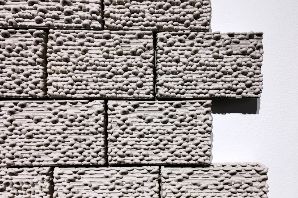 Despite the exhibition’s focus on ceramicists, “A Tipping Point” portends implications that are no less significant for architects. Rael and San Fratello’s collection also includes a series of sinuous clay tiles in development for use on a residential project. When completed, the building will be one of the first clad primarily in 3D-printed skin. Sabin’s Polybrick—like Rael San Fratello’s Cool Brick—points to a future in computer-driven masonry fabrication in which hollow chambers regulate light and air while interlocking geometries reduce the need for grout.