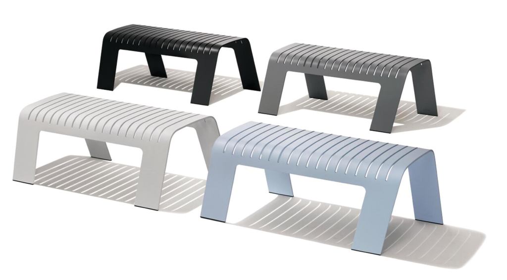 Ahrend601 Bench There are three versions of the 601 Bench available: one made from recycled compressed beech hardwood that is 100 percent recyclable; a second made from partially recycled aluminum alloy; and an outdoor version of the recycled compressed beech offering that is treated with Belmadur solution, a water-based weatherproof treatment. The sloping, low-scale design has no visible seams, bolts, or screws. Each piece is water-jet cut from a single rectangle of material that is then steam-bent into an outward curve. Complementary stools and occasional tables are available. ahrend.com; 973.652.4357.