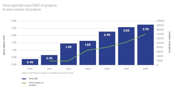Overall, total reported projects increased by 33 percent in 2016, now standing at 7,348 projects—a number that is largely attributed to increased reporting on smaller-scale projects—with gross square footage of buildings reaching 2.7 billion. Interior-only projects also jumped 48 percent to 6,604.