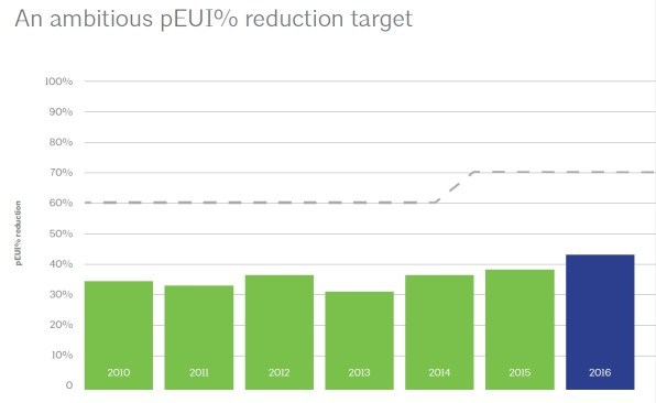 In order to attain these net-zero goals, the AIA has incrementally adjusted targeted predicted energy use intensity savings (pEUI) by 10 percent every five years. Signatories have failed to reach the 70 percent pEUI goal for two years.