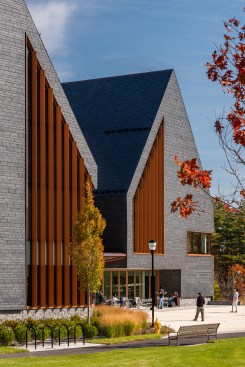 HGA, with builder Skanska and carpentry and roofing subcontractors, leaned into the project’s craftsmanship. (HGA acquired the project’s original designer, Boston-based Wilson Architects, in late 2018, near the start of construction.) Instead of the deep eaves typical of a barn, the slate roof crisply folds down to become slate walls, with just the barest of overhang. Building corners are devoid of visible exterior flashing. “Typically, to make it easy, you’d cover the corner,” says HGA principal-in-charge and science lead Chris Martin, AIA. “We wove the pieces of slate at the intersections of the roof and wall planes to keep everything sharp and clean.”