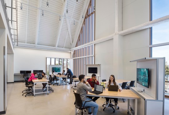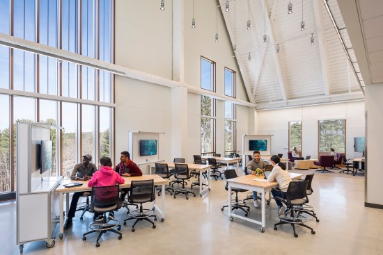 Inside the building, the lofty, light-filled spaces are flexible by design. Ceiling-mounted cord reels for power and an overhead distribution of plumbing services combined with rolling studio desks allow the labs to be reconfigured quickly. Some areas leave exposed the structural and mechanical systems, treated with acoustical and fireproofing coatings. As for those steep roof planes? The building had to be tall enough to accommodate bulky equipment in an enclosed mechanical penthouse. Snow guards on the roof help stabilize potential sheets of ice or snow from sliding down.