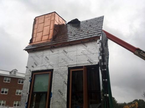 The first of two full-scale mock-ups allowed the team to test the design of the slate-shingle system with woven corners. A second mock-up, erected on the SNHU campus, allowed the architects and builders to perfect the connections between different materials.