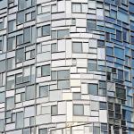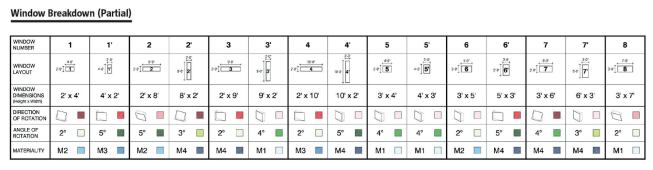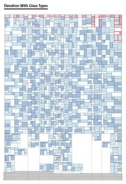 Further upping the intricacy, every window is canted between 2 degrees and 5 degrees up, down, left, or right. Angled aluminum extrusions clad the frame exteriors, helping ensure that the nonaligned windows remain watertight. While the triple-layer glass is colorless from inside, three shades of low-E coating create an external patchwork of reflected hues. Nevertheless, a discerning eye perceives the grid layout of the megapanels among these jumbled lenses, as well as the occasional repetition of glazing patterns.