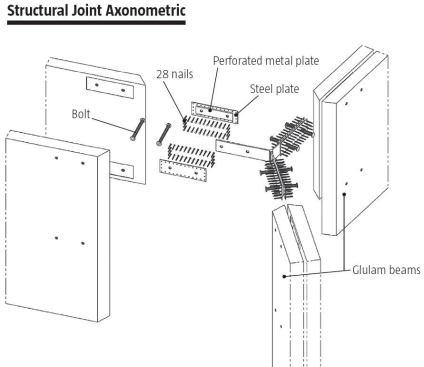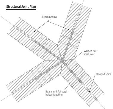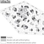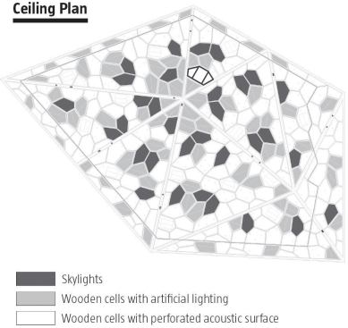 Each cell comprises four or five boards, laid on end and secured with a series of screws to a triple-flanged steel element at the vertex of each angle. The only adhesives used during the construction process were ecologically friendly glues. The cells serve a variety of functions: Some accommodate skylights, some house direct downlights; others filter indirect artificial light through a 3-inch-thick aluminum grating; and still others incorporate a perforated wood screen that masks acoustical felt.