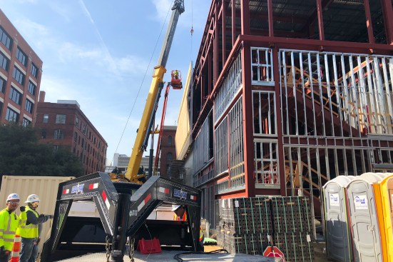 Baker Triangle’s virtual design and construction team divided Omniplan’s façade design into 88 individual subframing panels, each approximately 30 feet tall by 10 feet wide, and produced a digital model for each. The team deployed cold-formed steel, with studs 16 inches on center and what Pressley calls pyramid framing to create the running copper cladding facets. Because the facets occur at different locations for every stud, no two panels are alike. “It was one of the most complex geometries that we’ve worked with and one of those things that we love—nasty, complex, scratch-your-head, how-do-we-do-this projects,” he says.
