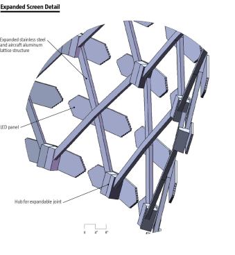 The team came up with a conical ellipse with a 3-to-4 ratio and a length of 79 feet that, when closed, is 23 feet tall, and when fully expanded grows to 66 feet (approximately seven stories tall). Its framework is based on Hoberman’s expanding Iris structure, which was used for the unfolding arch at the 2002 Winter Olympics in Salt Lake City. “We know that geometry very well,” Davis says. That familiarity made it easier to create an optimized screen that could also be broken down within approximately 8 hours and packed into shipping containers. (The steel claw takes much longer to assemble, so there are three identical structures that are leapfrogging from venue to venue.) Controllable LEDs are set in 888 panels that are in turn mounted to aluminum struts on scissor-like joints. The water-sealed LEDs (FLX modules from Innovative Designs’ parent company Barco) are individually mounted in the panels, so that in case of breakage they can be easily replaced. Together, the LED panels create a 3,800-square-foot screen surface. Eight winches in the claw raise and lower the screen over the stage. Forty chain hoists, connected to pick points on the latticelike screen frame, expand and support the 120,000-pound screen.