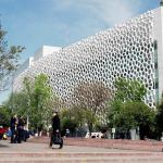 As part of a two-decade-long effort to clean up the megacity, the Erwin Hauer-esque screen covers 2,500 square meters (26,900 square feet) and runs 100 meters (328 feet) long. The façade comprises Elegant Embellishments’ white Prosolve 370e tiles—three-dimensional X- and I-shaped modules that attach to a steel substructure. Each lightweight, thermoformed plastic tile is coated with powdered, photocatalytic, air-scrubbing titanium dioxide (TiO2), a nanomaterial patented by Millennium Chem (now Cristal Global) in 2002.