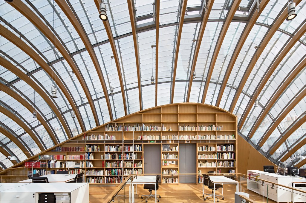 fifth-floor research center, housed in the voluminous vault with 32 exposed parabolic wood arches, with spans ranging from 10 feet to