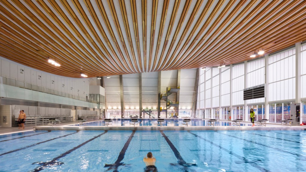 The result is the world’s longest-span timber-catenary roof, supported by what look like ribbons of Douglas fir stretching as long as 188 feet. The cables enable a remarkably thin roof that defines the 95,000-square-foot structure, which opened earlier this year and includes a 50-meter competition pool, waterslide, and a digital rain curtain.