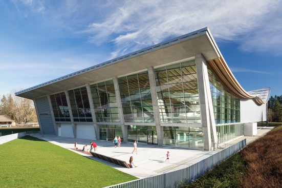 The center’s roof is just 18 inches deep, which includes the wood roof deck. (For comparison, the roof system of the nearby Richmond Oval, completed in 2008 and designed by CannonDesign, is about 8 feet deep.) Its slim profile reduces the building’s volume, eases maintenance, and eliminates the need for fire sprinklers in the bays between the glulam cables. Besides its maintenance benefits, a thinner roof is easier to sculpt, says Condon, who employed the catenary to express “a fluid form, something that would be reflective of the idea of water in motion.”
