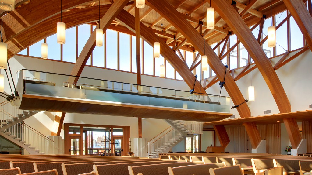 As symbols of radiating energy, 14 to 16 angled glulam struts on each of the six main arches act like flying buttresses to transfer the building’s dead loads: the roof over the 7,000-square-foot sanctuary, the soaring clerestories, and the church’s lower roof. As many as three struts and three knife blades converge at points along the arches.