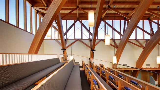 DiLoreto specified glulam made of locally sourced Douglas fir. Tualatin, Ore.–based Western Wood Structures used computer-controlled clamp beds to form 12 36-foot-long half-arches for the six main arches, and four 24-foot-long half-arches for the two end arches. Tractor-trailers hauled the structural components 25 miles from the Western Wood’s workshop to the church site.