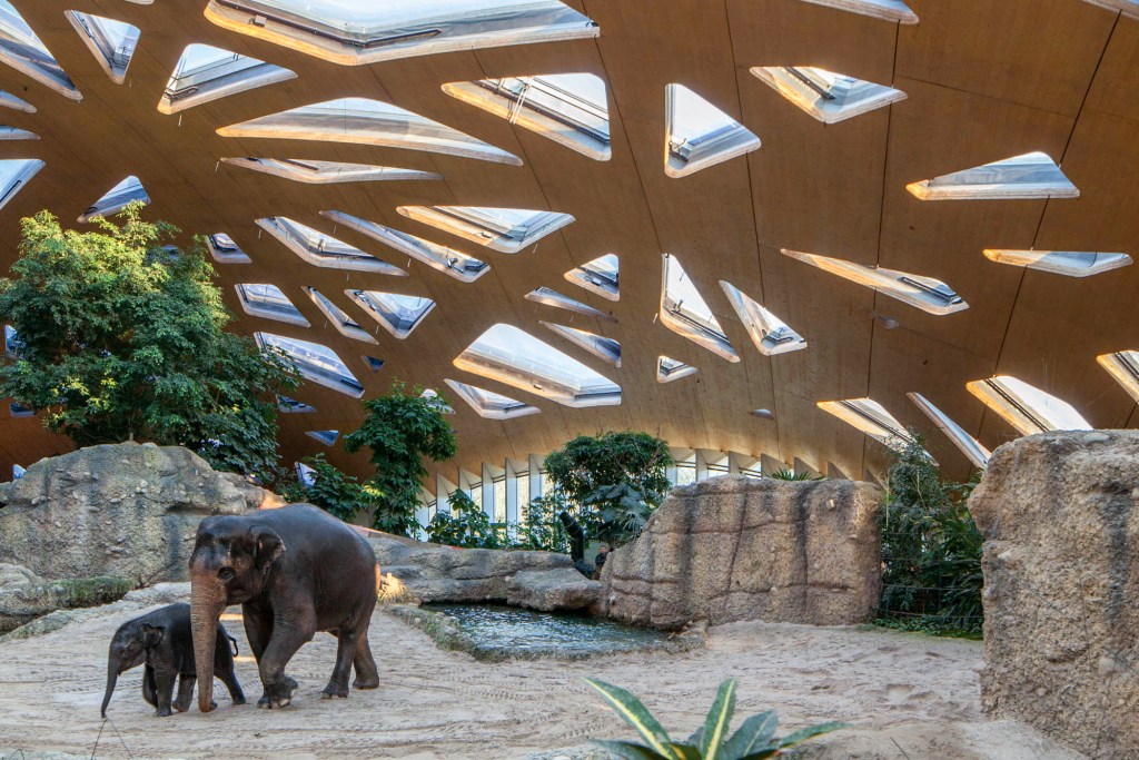 Rainwater and snowmelt harvested from the roof help feed the elephants' swimming pools.