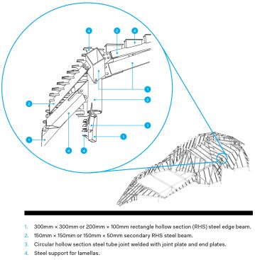 The cloak’s structure is a complex skeleton made of hollow steel tubes. Originally designed to be freestanding, the timber skin was eventually tied into the interior volume in a dozen places. Round steel nodes were designed to accommodate the structure’s complex geometries, which created points where as many as six steel columns meet. Welded to each support are standard steel plates that support the wood lamella. With tens of thousands of connections, the joinery had to be “extremely simple,” Hara says, “because otherwise it starts to be very, very expensive.”