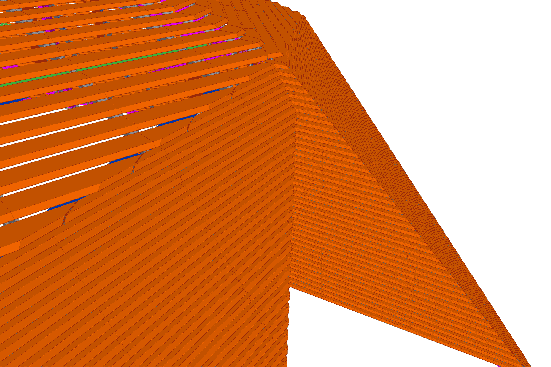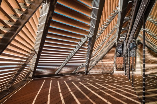 The pine planks were milled on CNC machines in Kuopio. Their outer edges were cut diagonally to continue the angle of the façade; a chamfer at the tip prevents breakage. Planks were then numbered and shipped to the site, where they were bolted to the steel structure. A slight angle allows the timber to shed water, keeping interior spaces dry and ensuring that rainwater doesn’t pool on the unfinished wood. Typically, Hara says, the glulam would be oiled, but the huge number of lamellas used on the project made this cost-prohibitive. If a single person were to oil all four sides of each lamella, it would take more than a year, Hara says, and by the time that person finished, they immediately “would need to start from the beginning.”