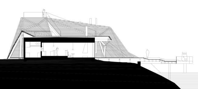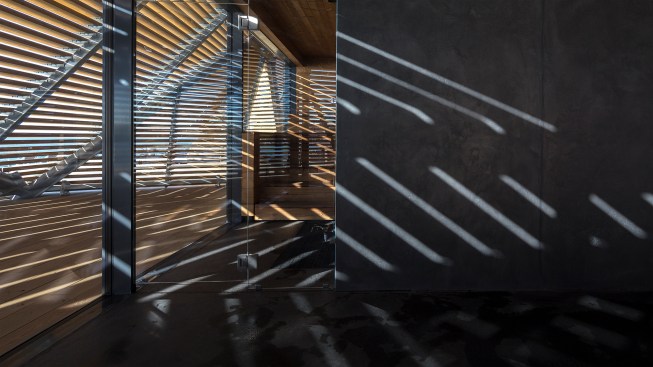 The project—spearheaded by actor Jasper Pääkkönen and entrepreneur and member of Parliament Antero Vartia—had several starts and stops following its initial 2011 proposal, but from the beginning, Hara says it was important to strike a balance between privacy and transparency. Formed by a series of sloping triangular planes created by thousands of wood lamellas, the cloak creates transitional spaces—open yet sheltered from the elements—for the periods before and after trips in to the sauna, and also shades the glazed inner volume. To the south, the façade flattens out to become stairs, which lead to a pair of roof terraces.