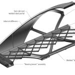 The stiff, helical frame serves as the truss web that transfers loads between the truss chords—linear steel members along the bridge’s top and bottom. Transverse strength is provided by two edge beams and the bridge deck—an approximately 110-millimeter-thick concrete deck cast in place on top of a steel deck, which contains a diagrid of 150- to 200-millimeter-tall stiffeners.